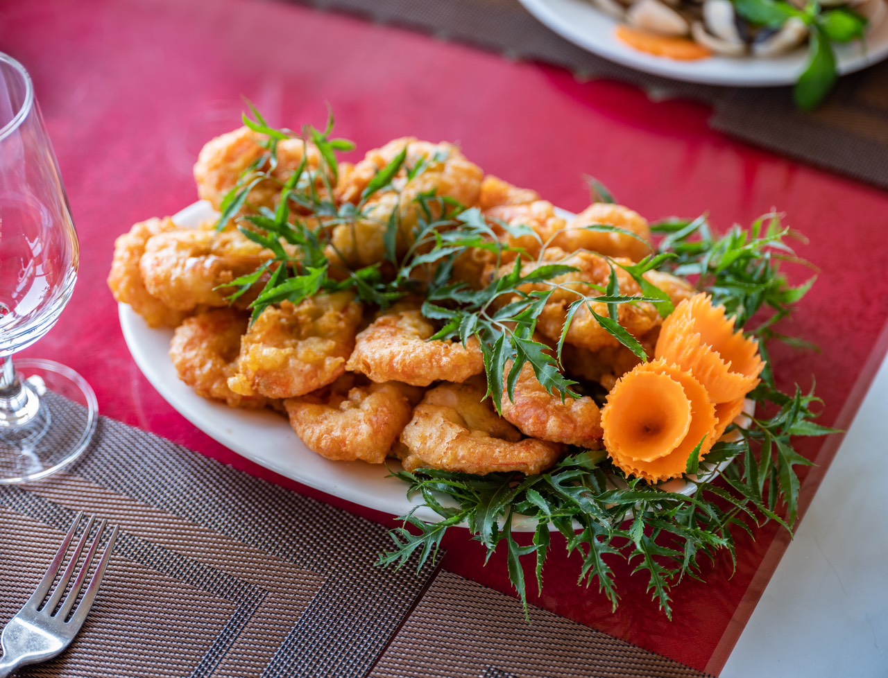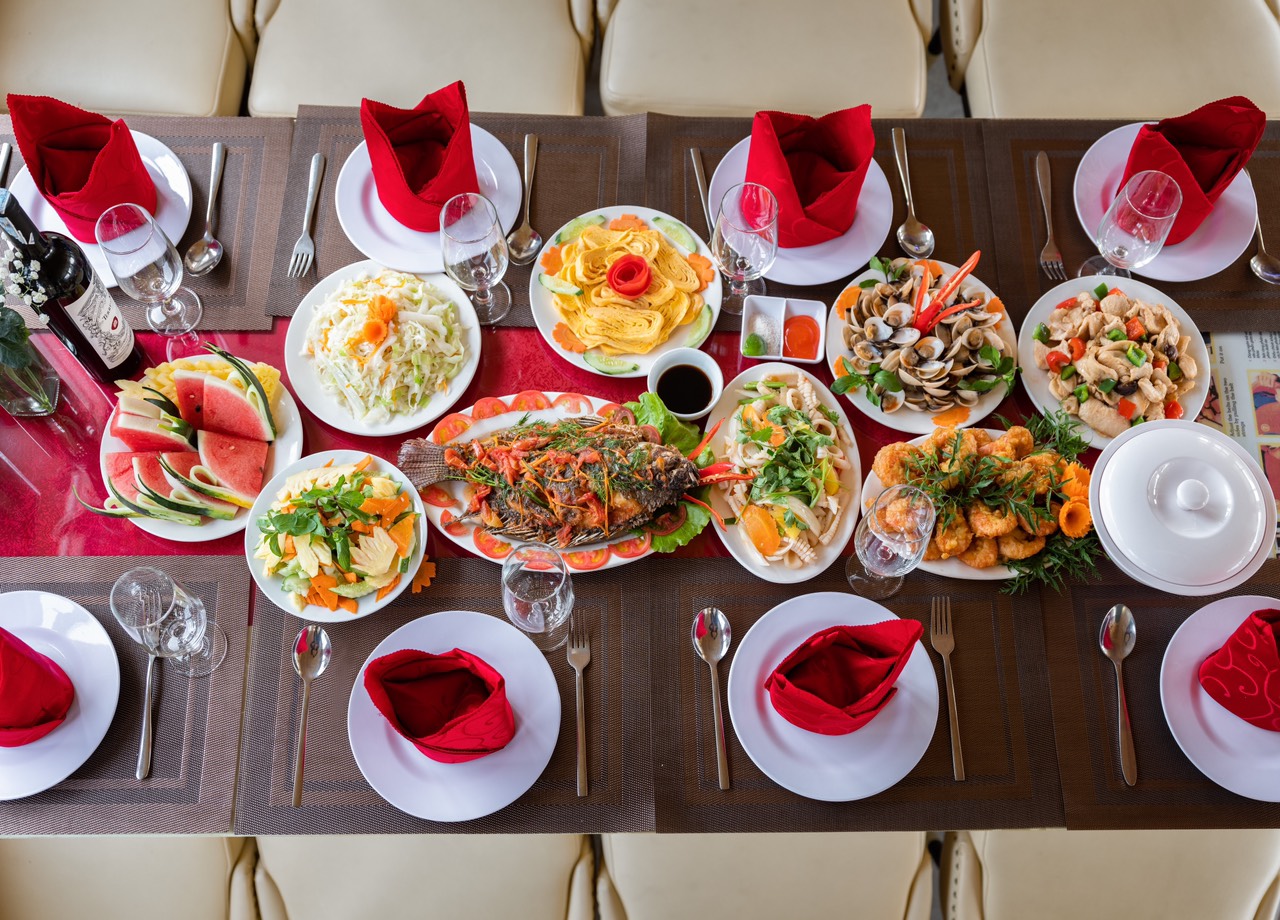 – 12:30: Welcome aboard and have Vietnamese traditional Lunch with seafood while cruising
